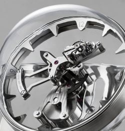 Împreună cu caracatitele și cu cronometrul marin, Octopod aduce și în minte atmosfera de sticlă futuristă a filmului lui James Cameron din 1989, The Abyss. În timp ce privitorul ar putea să se uite în afara sferei transparente, este ușor să vă imaginați că vă scufundați sub valuri și priviți spre uimitoarele creaturi irizate ale oceanelor adânci. Cu toate acestea, ați putea fi siguri că, în ciuda inspirațiilor sale acvatice, Octopodul este perfect acasă pe uscat.Octopod este disponibil în 3 ediții limitate de 50 de piese fiecare în PVD negru, PVD albastru și paladium (argint).