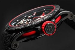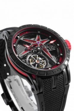 Indiferent dacă este din aur roz cu accente albe, din titan de culoare neagră sau roșu și negru, toate cele trei versiuni sunt echipate cu sistemul de desfacere rapidă al lui Roger Dubuis și are curele interschimbabile.