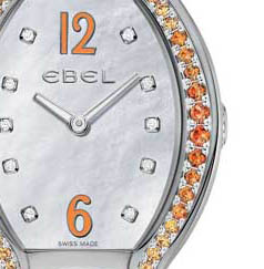 Orarul şi minutarul se plimbă elegant pe cadranul de sidef inscripţionat cu logoul Ebel şi printre diviziunile reprezentate de diamante cu formă pătrată ce formează un cadru delicat pentru cifrele marcând orele 12 şi 6. Mişcarea este posibilă datorită mecanismului elveţian quartz dinăuntrul carcasei.