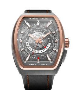 Acest ceas emblematic, alimentat de un mecanism automat, este cel mai rafinat ceas Frank Muller, cu afișarea imediată a două fusuri orare.