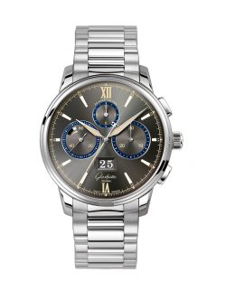 Fiabilitatea zilnică a funcțiilor sale și designul său excepțional fac din Senator Chronograph – Capital Edition, partenerul perfect pentru trendsetter-ii contemporani. Ca întotdeauna, fabrica saxonă a acordat o atenție specială detaliilor sofisticate: albastrul profund dinn jurul ecranelor cronografului apare contrastant cu cadranul gri elegant. Inelele strălucitoare de argint circumscriu ecranele mici, subliniind accente vizuale suplimentare. O carcasă din oțel cu diametrul de 42 mm din inoxidabil sau din aur roșu lustruit și satinat, încadrează ecranul “Bourbon Gray”, în timp ce carcasa din platină este o potrivire perfectă pentru cadranul cu “Argint uscat”. Săgețile de aur alb se scufundă elegant în cadranele de pe toate cele trei variante ale ceasului. O caracteristică Glashütte Original Panorama Data este data aplicată la ora 6, în timp ce afișajul rezervei de putere este setat discret în cercul secundelor mici de a ora 9. Contrastul dintre cusătura albă a curelei din piele de vițel în maro sau albastru este un alt element original de stil. Metalul brățării patentează un mecanism de ajustare în 8 pași fini garantand un confort optim pentru gentlemanul ce poartă versiunea din oțel inoxidabil a ceasului.Versiunile din aur roșu și platină ale Senator Chronograph-ului – The Capital Edition vin într-o cutie specială , în care va fi inclusă și o curea suplimentară.