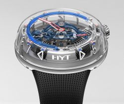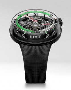 Noul ceas  HYT H2O oferă perspective radicale pentru timp, prin transparența 3D fascinantă, plus o formă asemănătoare unei pietre netezite, care a depășit timpul. HYT H2O poartă noutatea provenită din energia hidromecanică, fiind o reinterpretare a modelului HYT HO lansat anul trecut. Ceasul demonstrează uniunea esențială a artei și științei HYT, oglindită prin capacitatea de a contracara gravitatea și de a măsura trecerea timpului cu ajutorul unor fluide. Această tehnologie unește forțele cu un mecanism mecanic într-un întreg coerent, simbolic, al unei fuziuni fundamentale, fascinante a timpului și spațiului. Ceea ce se scurge este un ceas unic care respectă, facilitează și prețuiește fluxul timpului.