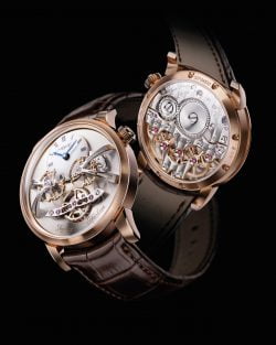Ceasurile Legacy Machine sunt reinterpretări ale invențiilor horologice semnificative ele celor mai mari ceasornicari din istorie. Deci, aspectul contemporan, cu cele două arcuri balansiere suspendate ale lui Legacy Machine No.2, o apariție din altă lume, cu un cadran cu arcuri cu patru brațe, ar putea părea la început ușor paradoaxal. Dar nu faceți nici o greșeală; LM2 este un ceas care își semnalează ADN-ul originar în urmă cu peste 250 de ani, la trei dintre cei mai mari ceasornicari care au trăit vreodată: Abraham-Louis Breguet (1747-1823), Ferdinand Berthoud (1727-1807) și Antide Janvier (1751-1835). Aceste legende horologice ale secolului al XVIII-lea sunt unite nu numai prin geniul lor inventiv, ci și de faptul că au construit ceasuri cu două balansiere. Oscilând pe înălțime, roțile duble de echilibru ale lui LM2 au fost inspirate de un omagiu adus unuia dintre cele mai rare mecanisme din istoria fabricării de ceasuri: regulatorul dublu. Și mai rar, ratele medii ale regulatoarielor duble din Legacy Machine No.2 sunt transmise printr-un singur diferențial, față de un angrenaj, caz în care majoritatea are două mecanisme separate.