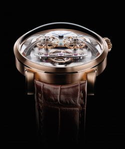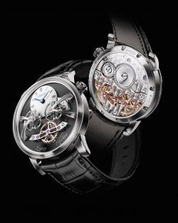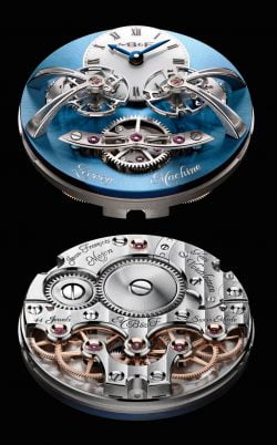 Diferențial: diferențial planetar format din 3 angrenaje și 5 pinioane Roți de echilibrare: Două roți speciale, de 11 mm, de echilibrare, cu patru șuruburi de reglare tradiționale, poziționate deasupra mecanismului și a cadranelor Arc balansier: sub formă curbă, tradițională Breguet, care se termină cu suportul știftului arcului spiral Frecvența: 18.000bph / 2.5Hz Numărul de componente: 241 de piese Numărul de rubine: 44 Finisare manuală superlativă stil secolul XIX: Suprafețe interioare lustruite care evidențiază artizanatul Casei; muchii lustruite, gravură Geneva, gravură frezată – model gheare de pisică; gravuri manuale Funcţii: Ore și minute Diferențial planetar care transmite cuplul celor două regulatoare. Carcasă: Material: ediții de lansare în aur roșu 18 k, aur alb 18k și platină 950 în ediție limitată de 18 bucăți; și o versiune reproiectată în titan Ti-6Al-4V (grad 5) într-o ediție limitată de 18 bucăți Dimensiuni: ediții de lansare: 44 mm x 20 mm, titan ediție: 44 mm x 19 mm Numărul de componente: 45 (ediții din aur roșu sau alb și platină), 41 (ediție titan) Rezistența la apă: 30 m / 3 atm Cristale de safir: Cristal de safir deasupra și cristal de safir pe verso, cu înveliș anti-reflectorizant pe ambele părți. Curea și cataramă: Curea de aligator cusută manual, cu cataramă de aur de 18k, platină sau titan, care se potrivește la carcasă.