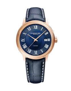 Indicatoarele contemporane rafinate oferă o legătură elegantă pentru cifrele romane albe ale cadranului. Maestro Blues cu carcasa placată cu PVD din aur roz are o deschidere de dată la ora 3, în timp ce versiunea din otel inoxidabil este echipată cu o deschidere la amiază, dezvăluind subtil inima ceasului. Ambele versiuni vin perfect cu o curea din piele albastră, cu cusături albe.
