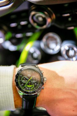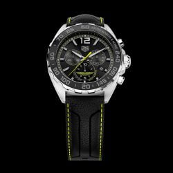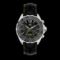 Al doilea model este un cronograf TAG Heuer Formula 1 inspirat de Aston Martin Racing. Modelul TAG Heuer Formula 1 este modelul Tag Heuer pentru motor racing, sinonim cu performanța și viteza. În întregime din oțel și cu diametrul de 43 mm, acest cronograf cu cuarț are un bezel din oțel zincat și un inel de aluminiu cu scala tahimetrică. Indicii, secundarul și celebrul logo Aston Martin înaripat, toate nuanțele specifice de lime, specifice Aston Martin Racing, se opun cadranului negru al ceasului pentru un efect contrastant de excepție. Mecanismul are precizie de zecime de secundă – o caracteristică indispensabilă la un ceas pentru curse auto – și timpul este afișat pe contorul mic de la ora 6, contorul de minute la ora 9 și contorul secundar curent la ora 3. Modelul vine cu o curea din piele neagră. Din nou, acest lucru este valabil exclusiv pentru Aston Martin, deoarece aceasta este prima dată când TAG Heuer folosește o curea din piele în colecția TAG Heuer Formula 1. Cu esență de var esențial, se adaugă caracterul și stilul sportiv la ceas. Cusăturile în culoarea limei, adaugă un caracter și un stil sportiv ceasului.